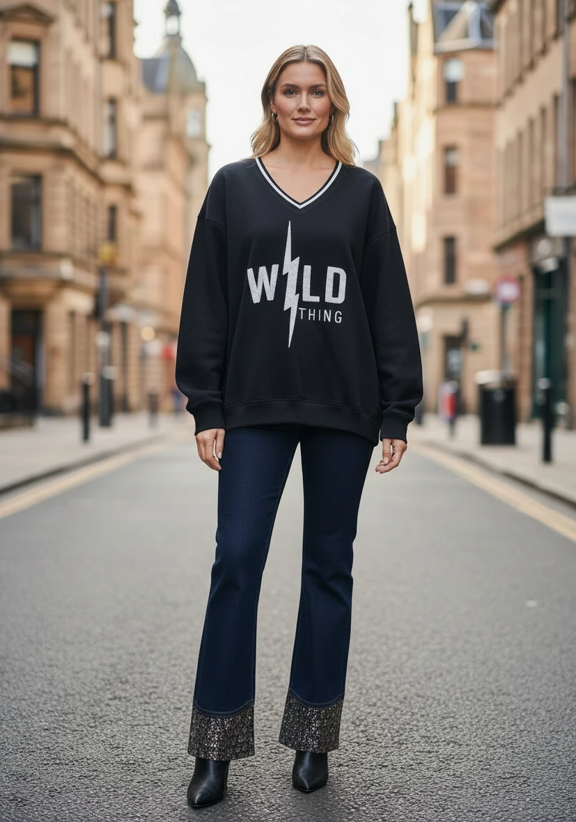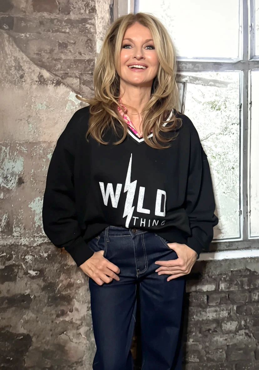 Damen-Sweater mit V-Ausschnitt und Kontraststreifen, lässig-klassischer Schnitt. Großflächige Pailletten-Applikation vorn als Hingucker. Breite Bündchen und Saum sorgen für perfekten Sitz und modernen Look.